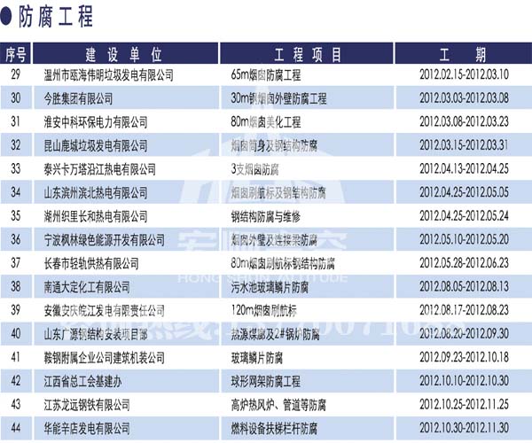 宏順建設核心技術 宏順建設專業承接各種煙囪新建,磚煙囪新建,煙囪防腐,煙囪滑膜,煙囪改造,煙囪內壁防腐,煙囪脫硫防腐等工程,有多年的成功經驗...解詳情